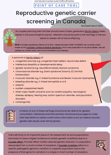 We have developed five (5) point of care tools to assist clinicans in assessing individuals and couples and their eligibilty for carrier screening as per current Canadian guidelines. Download the full suite of tools, those for Ashkenazi Jewish ancestry, French Canadian ancestry, Hemoglobinopathies or Condition specific recommendations (i.e. Fragile X syndrome, cystic fibrosis and spinal muscular atrophy).